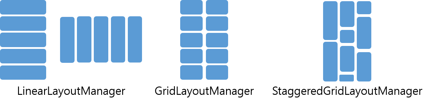 RecyclerView 에서는 LayoutManager 를 통해 하단과 같은 타입의 리스트들을 지원한다.