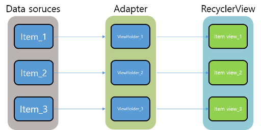 Adapter 는 하단과 같이 데이터와 화면에 출력될 item view 를 연결해 주는 역할을 한다.