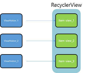 RecyclerView 에서는 ViewHolder 패턴을 의무적으로 사용하여 성능저하를 미연에 방지하도록 만들었다.
