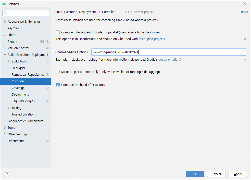 하단과 같이 'Command-line options' 에 명령어를 추가하자.