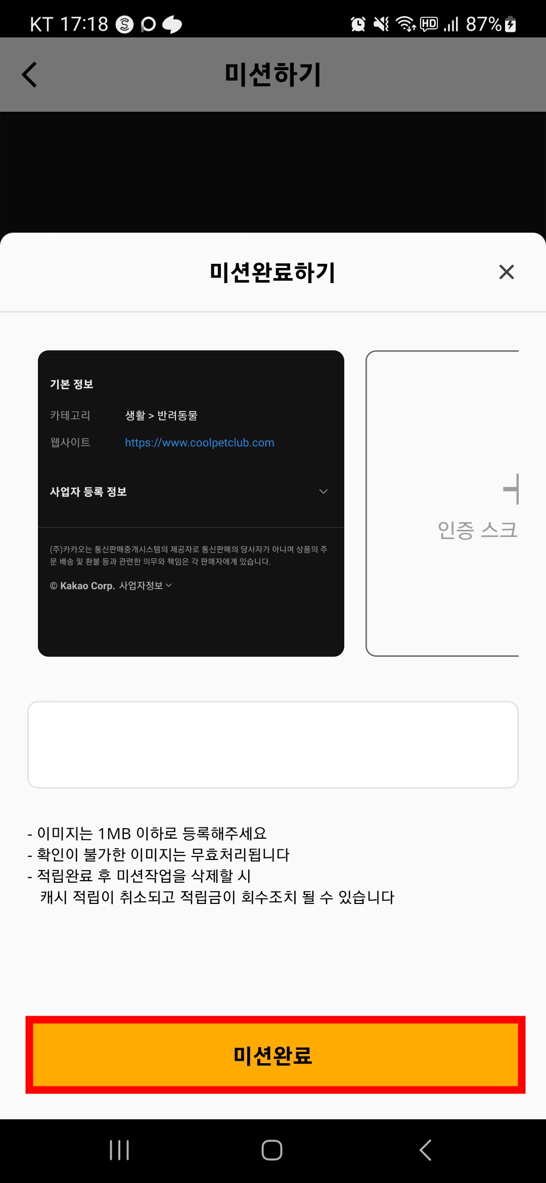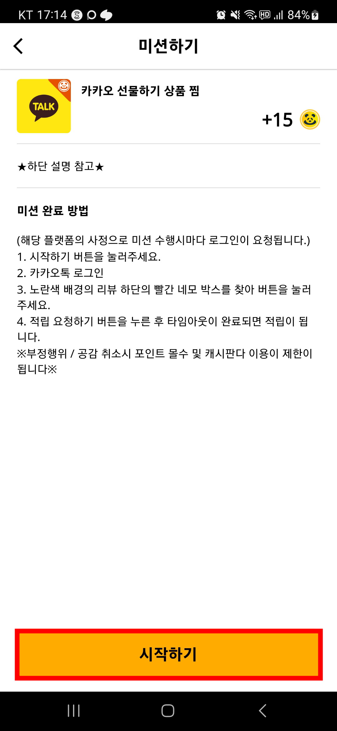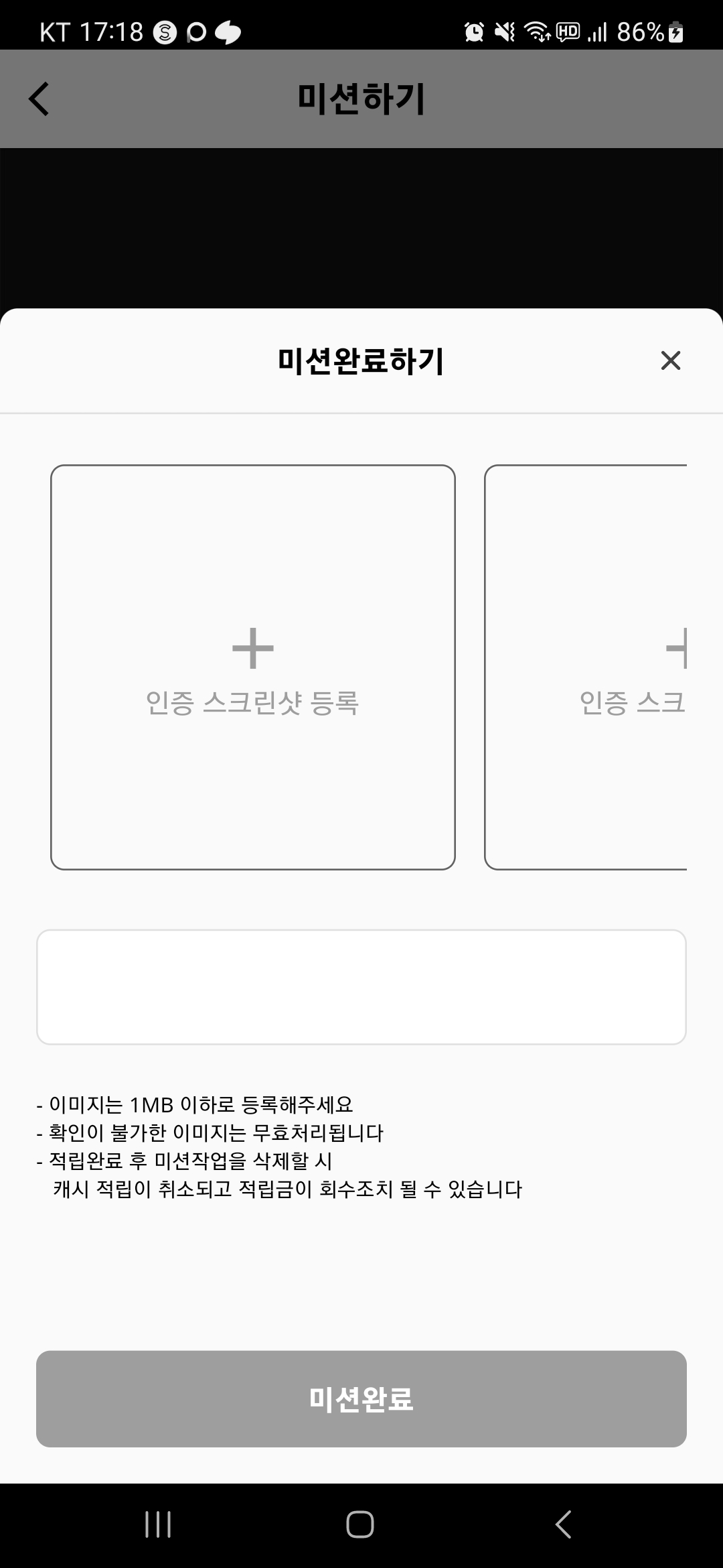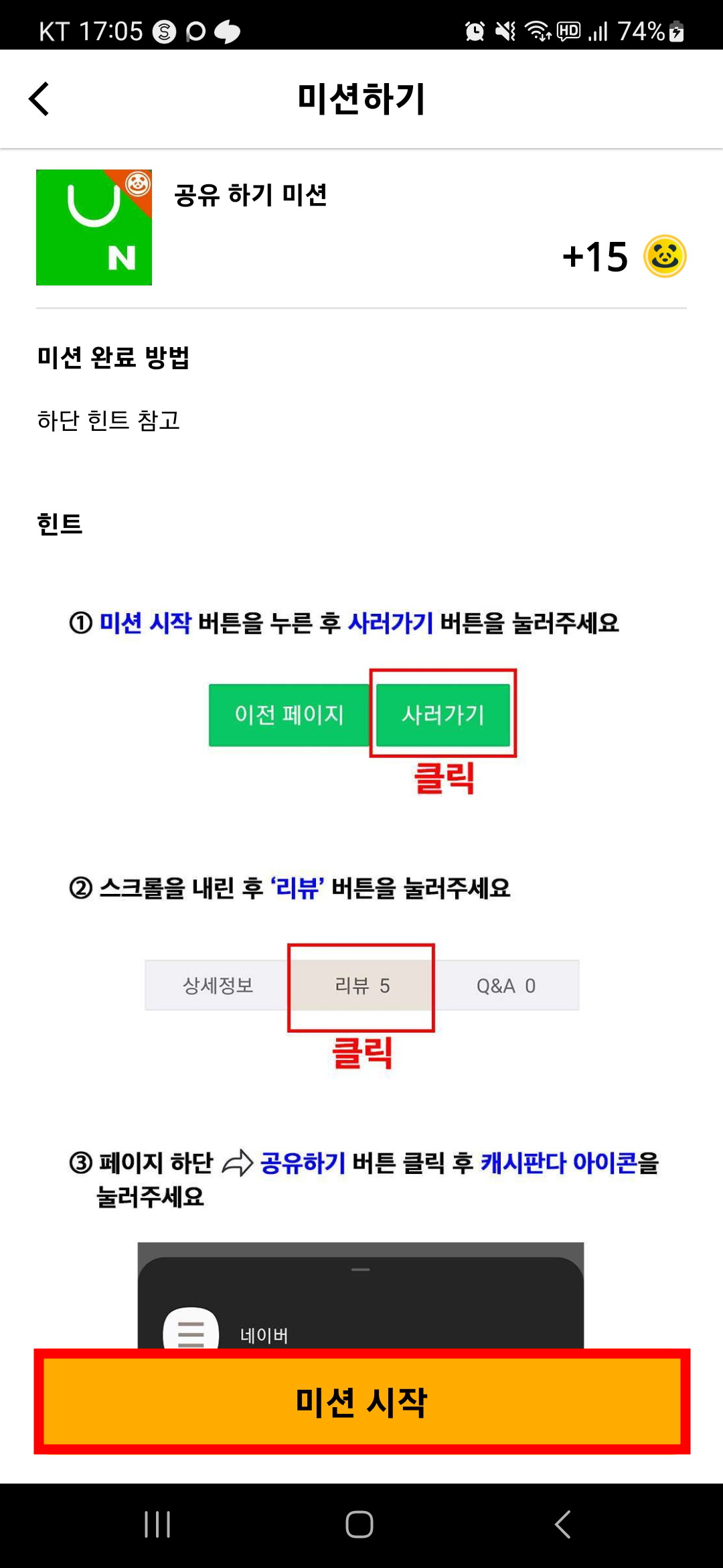 - 적립을 원하는 미션 항목을 클릭하여 각 미션을 완료하면 캐시를 적립할 수 있다.