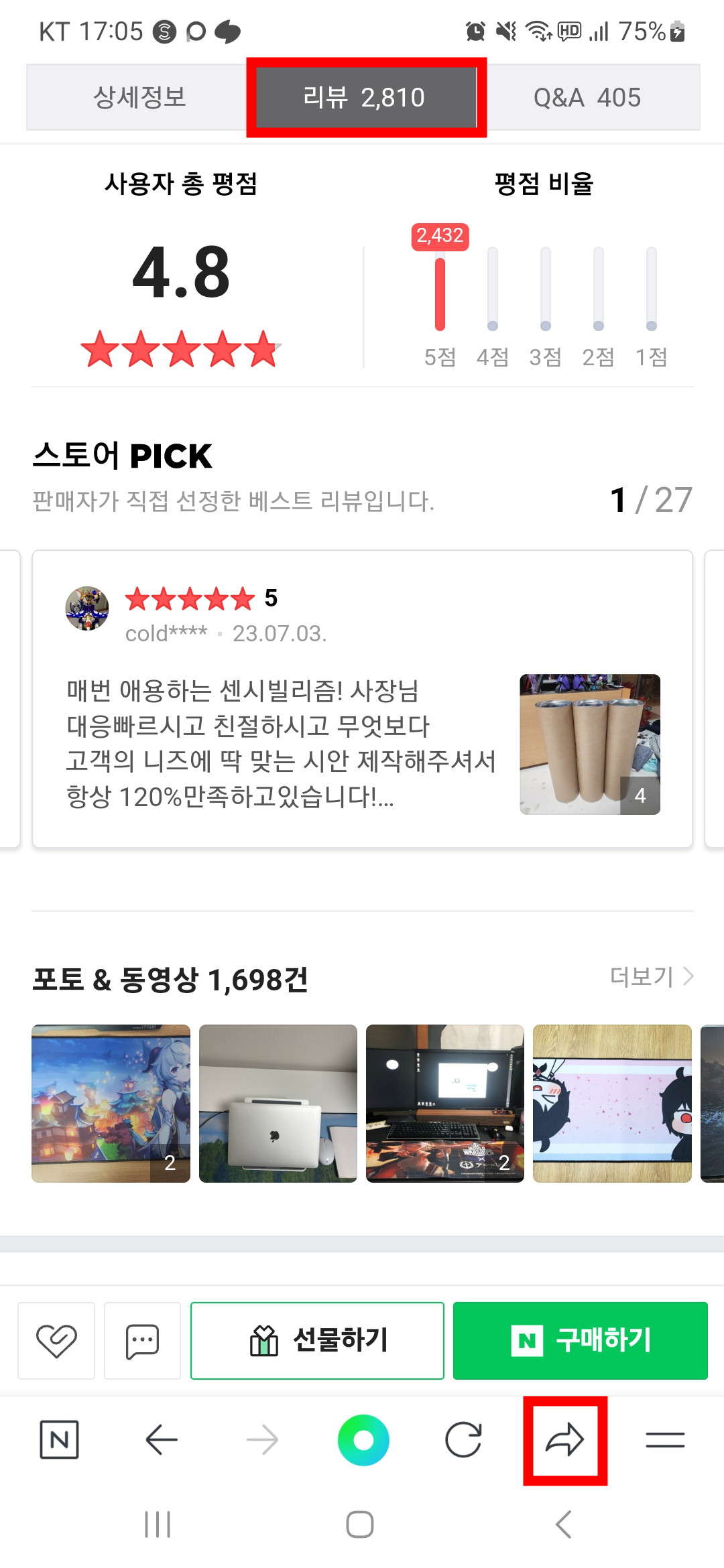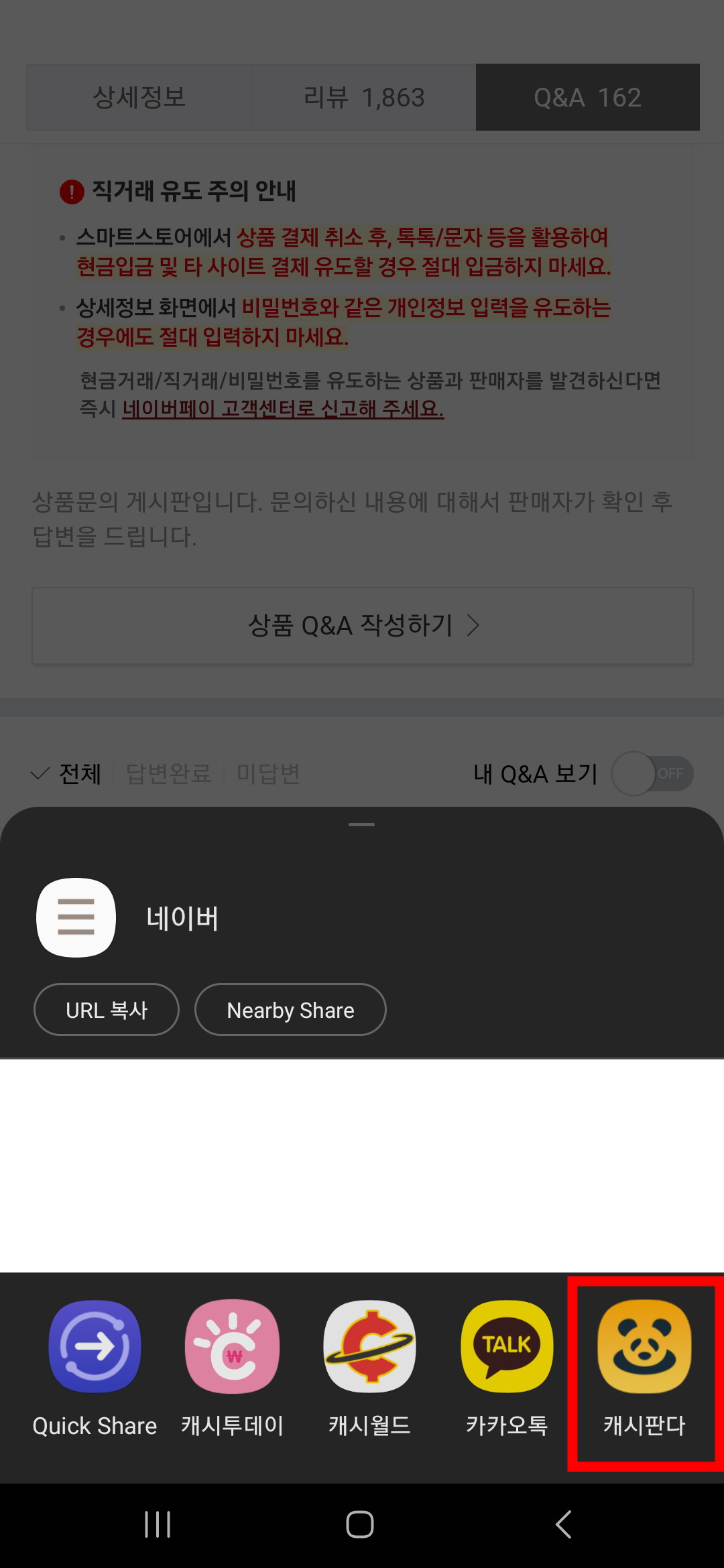 - 브라우저에서 공유버튼을 클릭하여 '캐시판다' 를 선택한다.