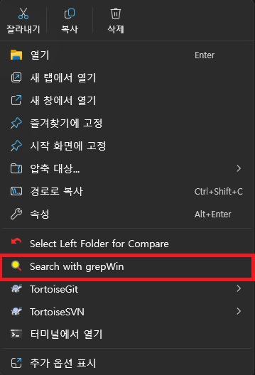검색하려는 프로젝트 폴더에서 우클릭 > grepWin 선택