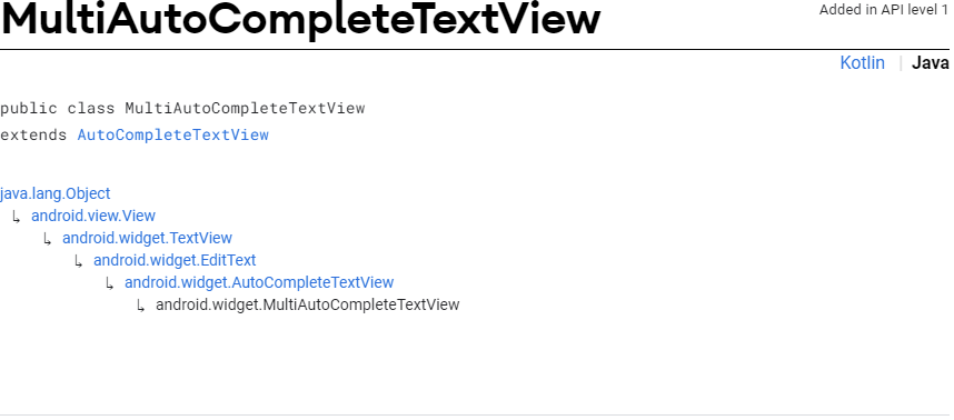 MultiAutoCompleteTextView 는 AutoCompleteTextView 를 상속받아 동일하지만 CommaTokenizer 를 설정한다는 점에서 다르다.