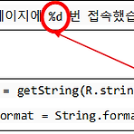 이번 포스팅에서는 string.xml 에 format(%d, %s) 을 이용하여 문자열을 동적으로 변경하는 방법을 소개한다. Example 하단과 같이 숫자 3 이 고정된 값이 아닌 경우 문자열을 고정된 값이 아닌 경우에 따라 변경해야 하는 경우 현재 페이지에 3 번 접속했습니다. Code [res/value/string.xml] [Activity] Description 하단 그림과 같이 format 에 맞는 값을 대입하면 해당 포맷형태로 변경되게 된다.